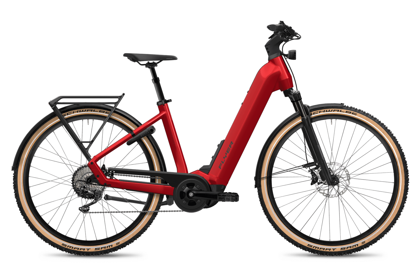 - Ausgestattet mit Schutzblechen, Gepäckträger und Flyer Lichtanlage